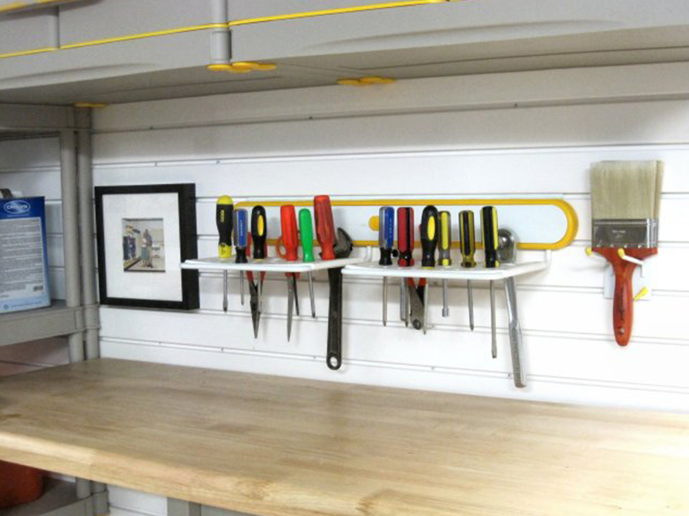 Every garage needs a solid workspace and GarageTek has the ideal product selection. The fold-down workbench allows space-saving option when not in use.In addition, you can store the smallest nails to the heaviest tools in your uniquely designed set up.