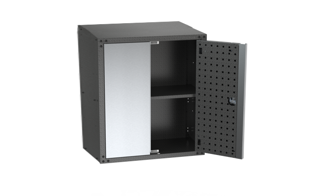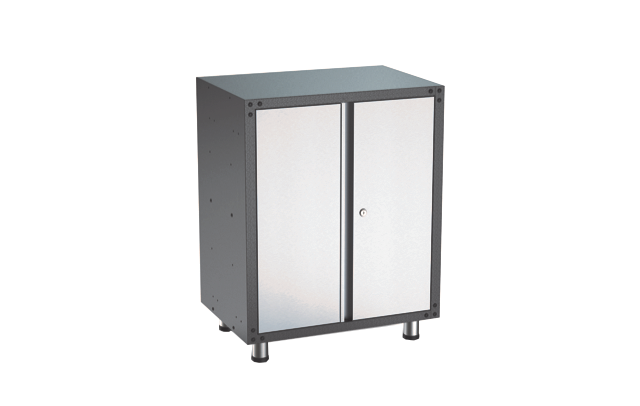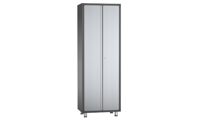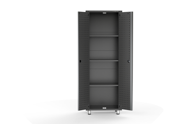 - Includes two full-size metal cabinets with three moveable shelves and adjustable feet and mounting bracket
