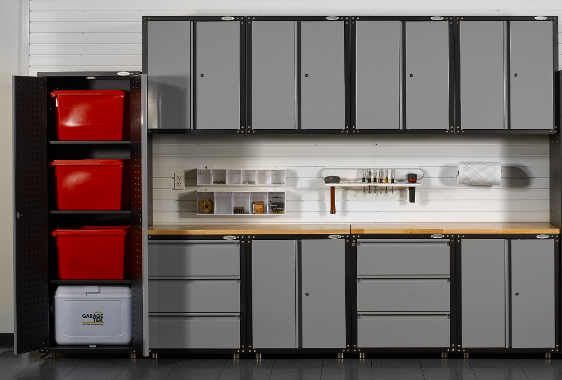 To protect your belongings that will be stored in the garage from climate changes as well as unwelcome pests, particularly paper and fabric, place items in labeled plastic bins. This approach will help you know exactly what is inside and give you an ability to easily find what you need once these items are stored in GarageTek overhead racks, shelves and cabinets.